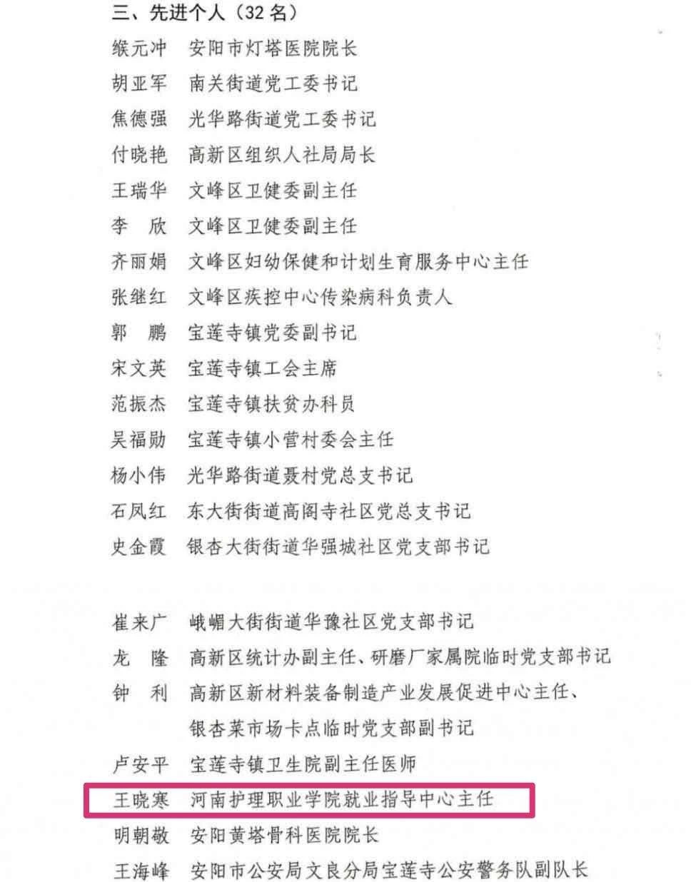 同时在此次疫情防控工作中,我院王晓寒同志以防控为己任,积极投身防控一线,被授予文峰区新冠肺炎疫情防控工作先进个人荣誉称号,为我院师生充当了先锋楷模的模范作用。