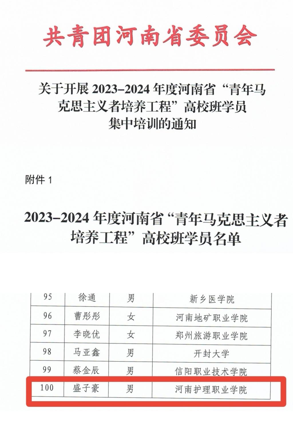 近日,共青团河南省委公布了2023-2024年度河南省“青马工程”高校班学员名单,我校2022级护理系急救护理班学生盛子豪榜上有名,成功入选2023-2024年度河南省“青马工程”高校班。