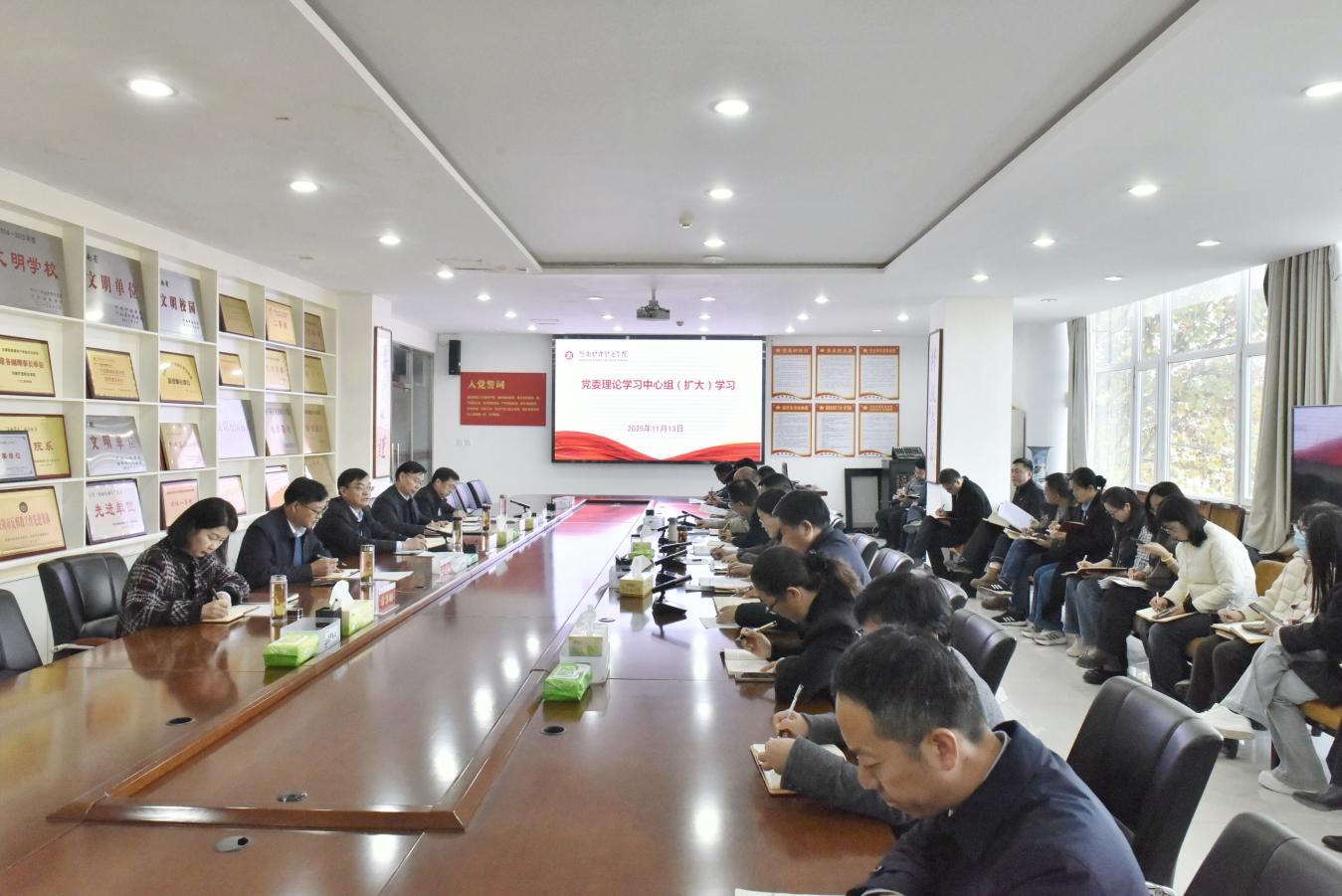 11月13日下午,我校召开党委理论学习中心组(扩大)学习会,专题学习党的二十届四中全会精神。校领导班子成员、各部门党政负责人参加会议。会议由党委书记、院长胡仕坤主持。