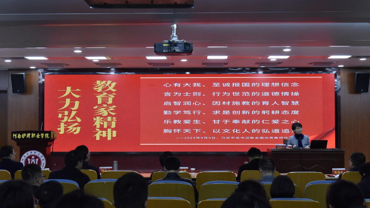 为深入学习贯彻习近平总书记关于教育的重要论述,弘扬教育家精神,推进师德师风建设,11月18日下午,我校特邀全国最美教师、教育部2025年巡讲团成员、郑州大学周荣方教授开展专题培训。学校领导出席会议,副科级及以上干部、全体专兼职教师及辅导员参加培训。会议由学校党委副书记、工会主席钟会亮主持。